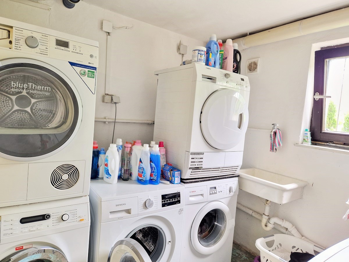Ein Waschraum für die Gemeinschaft stehen zur Verfügung. Der Platz für Waschmaschine und Trockner im Keller verfügt ebenfalls über eine eigene Wasseruhr und Stromanschluss.